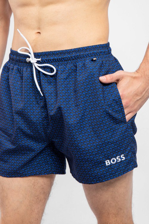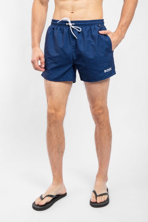 Мужские темно-синие пляжные шорты от Hugo Boss (Хуго Босс). Принт по всей поверхности, принт логотипа, эластичный пояс на завязках, боковые карманы, короткая длина.