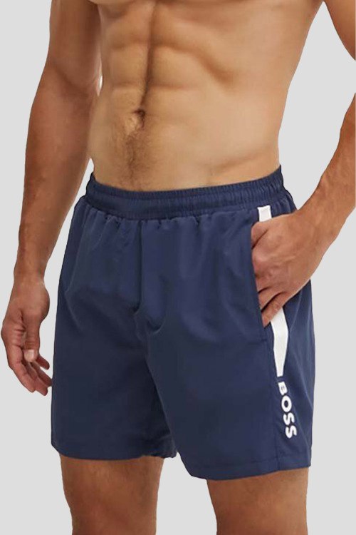 Детали: Мужские темно-синие пляжные шорты Dolphin из полиэстера от Hugo Boss (Хуго Босс). Эластичная резинка на поясе с кулиской, лампасы, брендированный принт, прорезные карманы, накладной карман сзади