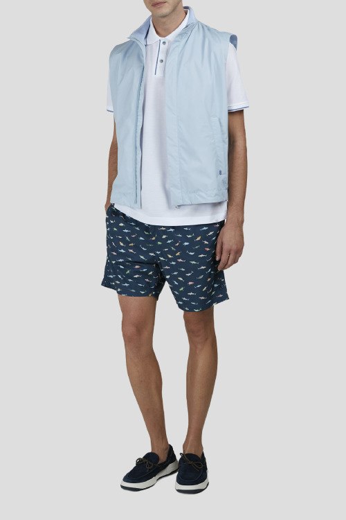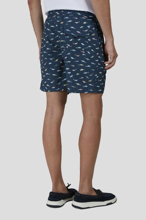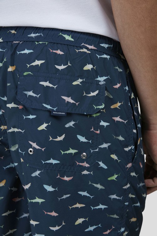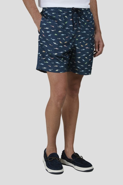 Детали: Мужские темно-синие пляжные шорты от Paul & Shark (Пол энд Шарк). Принт по всей поверхности, эластичный пояс на завязках, боковые карманы, длина выше колен