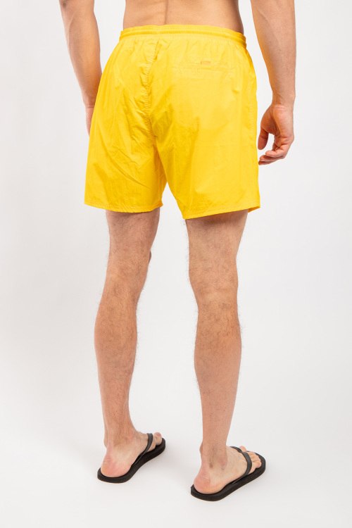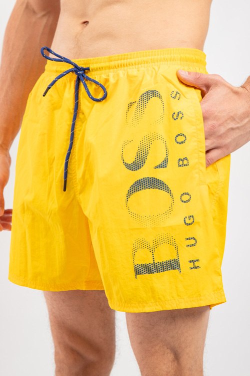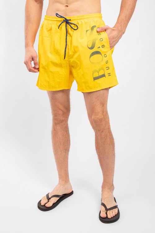 Мужские желтые пляжные шорты от Hugo Boss (Хуго Босс). Принт с логотипом, эластичный пояс на завязках, боковые карманы, длина выше колен.