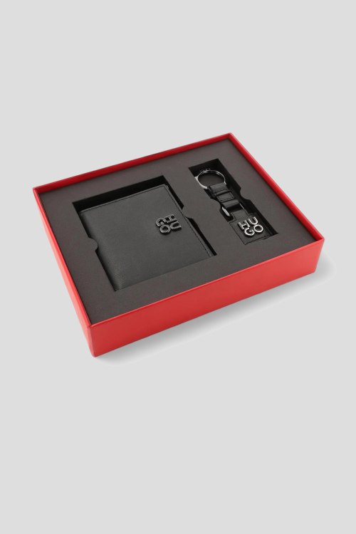 Детали: Мужской черный набор из натуральной кожи от Hugo by Hugo Boss (Хуго бай Хуго Босс). Подарочный набор состоит из брендированного брелока, кошелек с карабином, металлический логотип бренда, фирменная упаковка