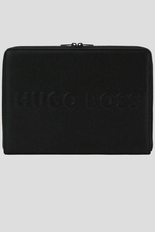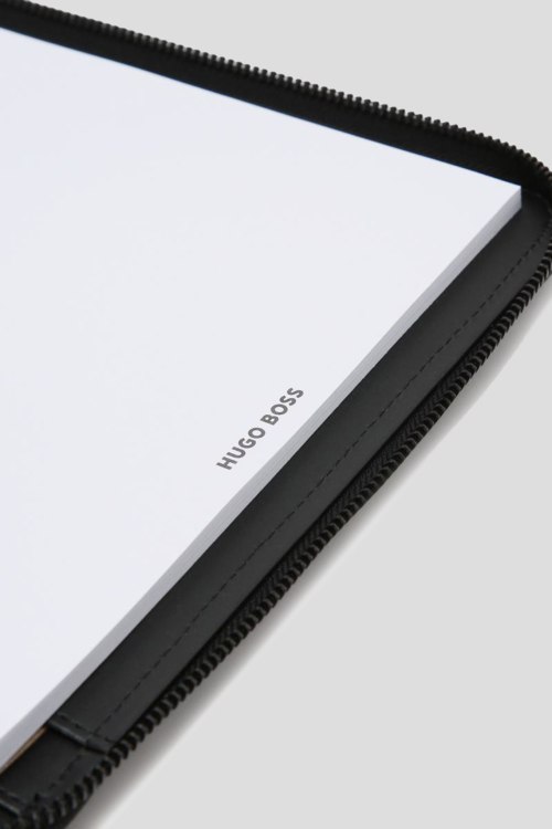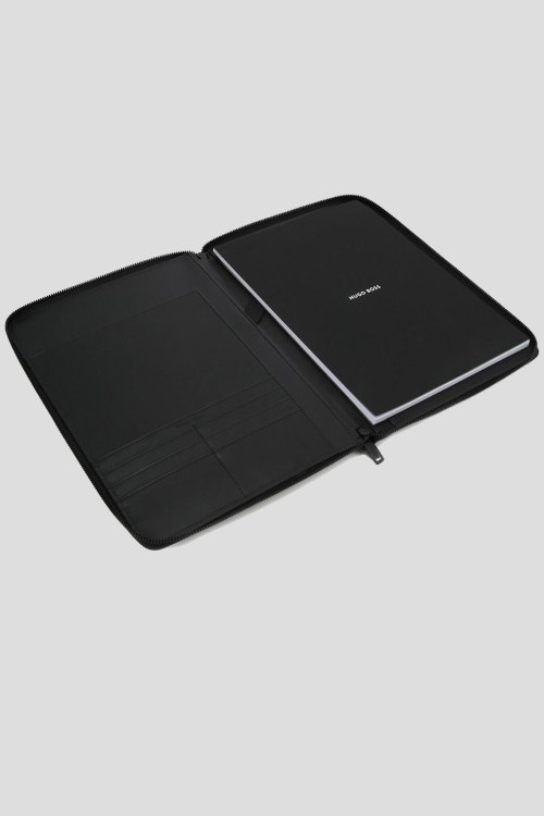 Детали: Мужской подарочный набор (папка для документов, блокнот) от Hugo Boss (Хуго Босс). Набор Hugo Boss создан для людей, которые ценят функциональность и элегантность в повседневной работе. В него входит папка для документов и фирменный блокнот, идеально подходящий для ведения записей во время деловых встреч или конференций. Папка изготовлена из натуральной кожи в базовом черном цвете. Она оснащена внутренними органайзерами, которые помогают удобно разместить документы, карточки, ручки и т.д. Внешне она декорирована объемной надписью с названием бренда. Размер: 32 x 24 x 2,5 см