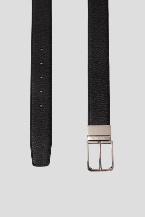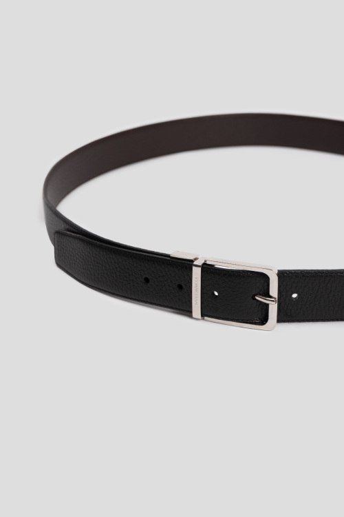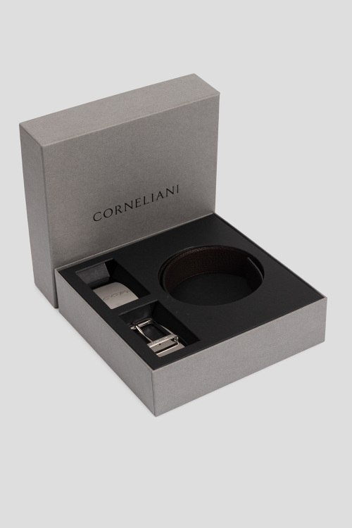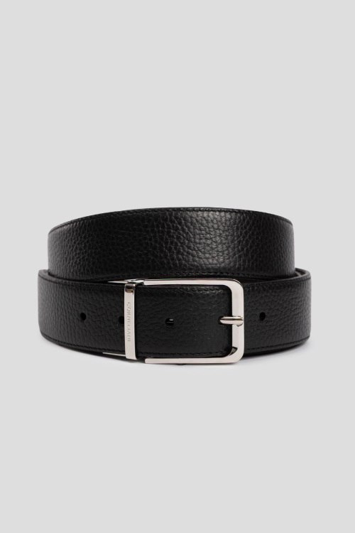 Детали: Мужской черный кожаный ремень от Corneliani (Корнелиани). Модель из зернистой кожи, две серебристые пряжки