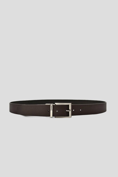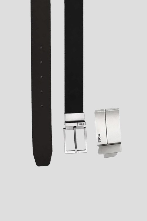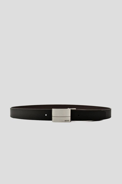 Детали: Мужской черно-коричневый двухсторонний кожаный ремень от Hugo Boss (Хуго Босс). Модель из гладкой кожи, серебристая пряжка с логотипом