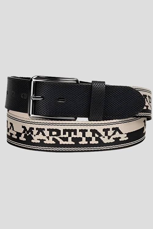 Детали: Мужской черно-бежевый ремень из текстиля и кожи от La Martina (Ла Мартина). Комбинация цветов и материалов, принт с логотипом, металлическая пряжка. Ширина - 4 см