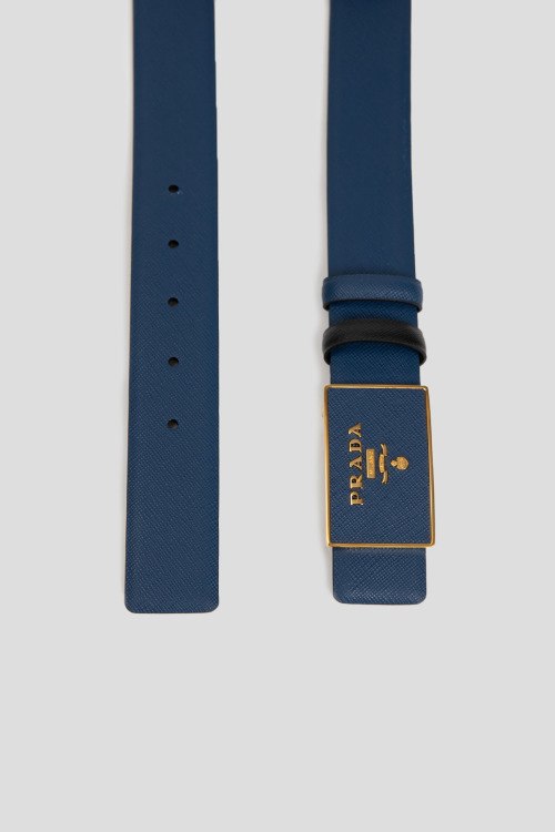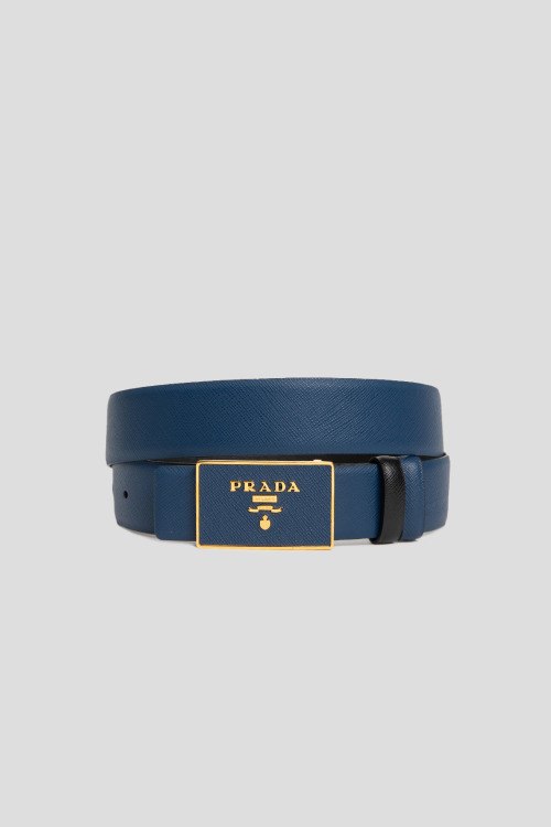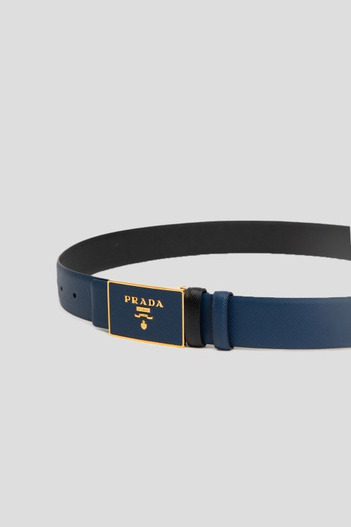 Детали: Мужской синий ремень из натуральной кожи от Prada (Прада). Фактурный узор, прямоугольная пряжка с металлической золотистой отделкой и логотипом. Длина: 110 см