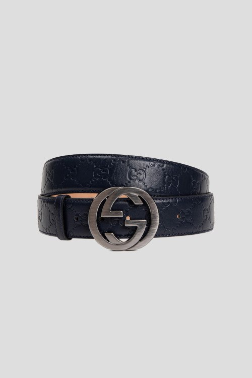 Детали: Мужской темно-синий кожаный ремень Gucci Signature от Gucci (Гуччи). Модель из гладкой кожи, монограмма по всей поверхности, металлическая серебристая пряжка Double G. Длина 125 см, пряжка 3,5 см
