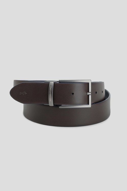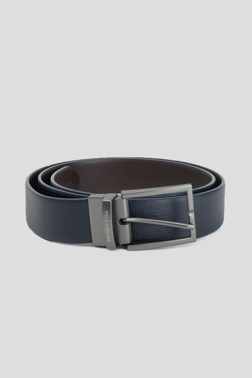 Детали: Мужской двухсторонний кожаный ремень от Paul & Shark (Пол энд Шарк). Темно-синий и темно-коричневый цвет, гладкая кожа, серебристая пряжка