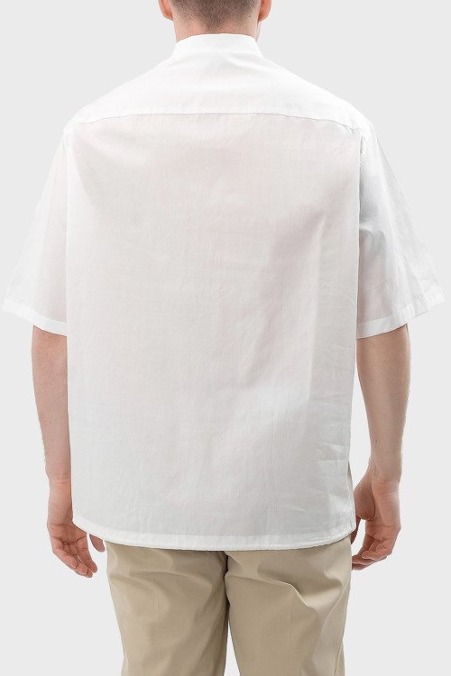 Детали: Мужская белая хлопковая рубашка от Emporio Armani (Эмпорио Армани). Вышитые пальмы, отложной воротник, скрытая застежка на пуговицы, короткий рукав, классическая длина