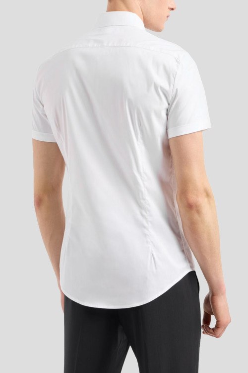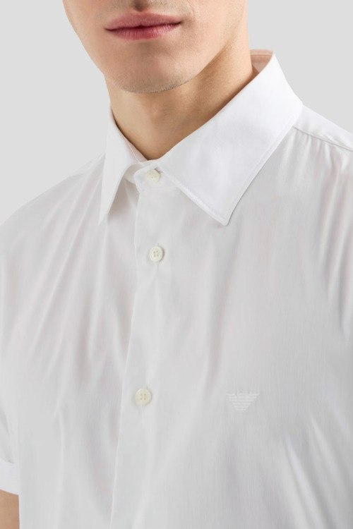Детали: Мужская белая хлопковая рубашка от Emporio Armani (Эмпорио Армани). Вышитый логотип на груди, отложной воротник, застежка на пуговицы, короткий рукав, закругленный нижний край