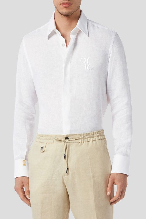 Детали: Мужская белая рубашка из натурального льна от Billionaire (Биллионер). Классический воротник, застежка на пуговицы, длинные рукава, манжеты на пуговице, фигурный низ изделия, вышитый логотип бренда