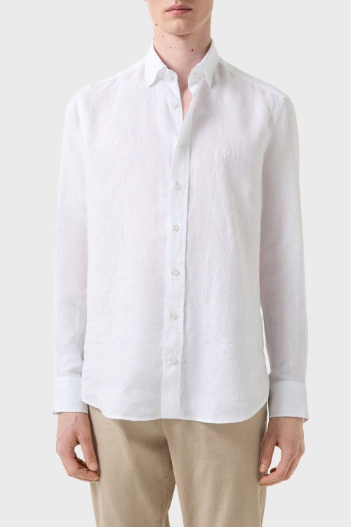 Детали: Мужская белая льняная рубашка Timi от Bogner (Богнер). Логотип на груди, отложной воротник, застежка на пуговицы, манжеты на пуговицах, классическая длина