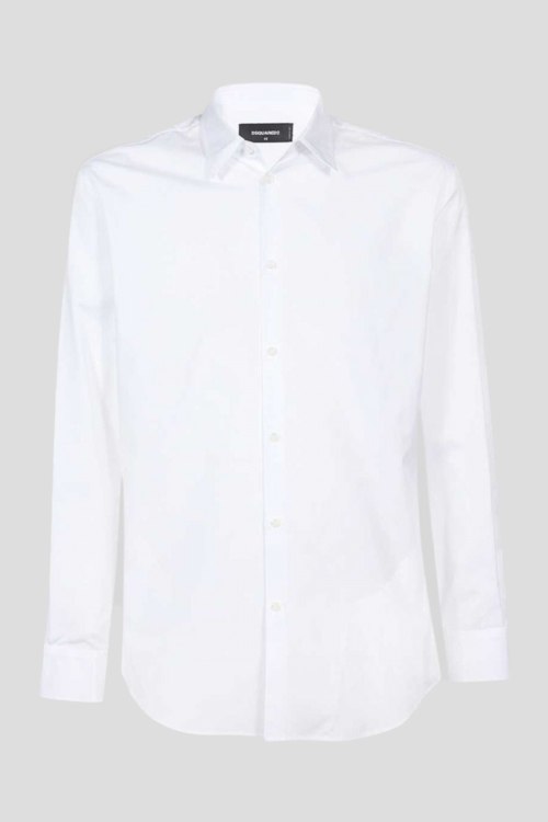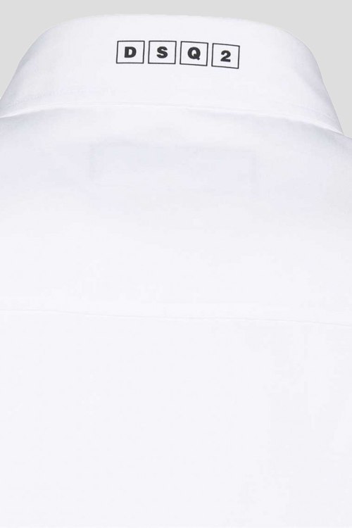 Детали: Мужская белая рубашка Relaxed Dan из хлопка от Dsquared2 (Дискваред). Классический воротник, застежка на пуговицы, длинные рукава, манжеты на пуговице, фигурный низ изделия, принт с логотипом бренда на воротнике