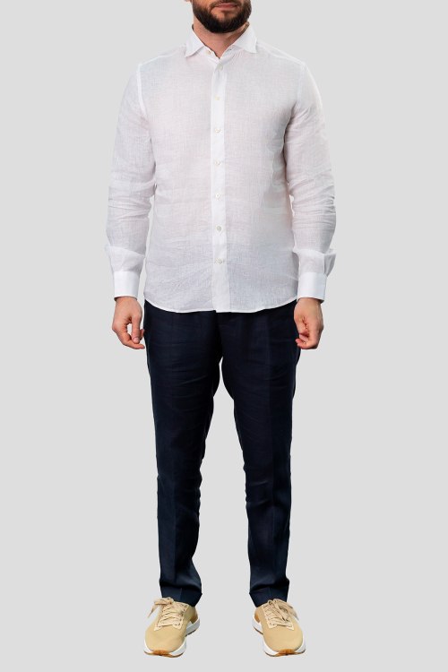 Детали: Мужская белая льняная рубашка от Gran Sasso (Гран Сассо). Отложной воротник, застежка на пуговицы, манжеты на пуговицах, классическая длина