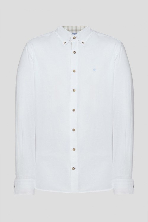 Детали: Мужская белая хлопковая рубашка от Hackett (Хаккетт). Логотип на груди, отложной воротник, застежка на пуговицы, манжеты на пуговицах, классическая длина. Длина рукава: длинный, для размера М - 65 см, обхват груди: для размера М - 110 см, обхват талии: для размера М - 100 см, длина изделия по среднему шву спинки от горловины: для размера М - 74,5 см