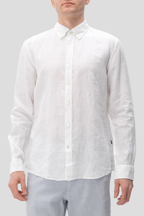 Детали: Мужская белая льняная рубашка Roan от Hugo Boss (Хуго Босс). Логотип на груди, отложной воротник, застежка на пуговицы, манжеты на пуговицах, классическая длина