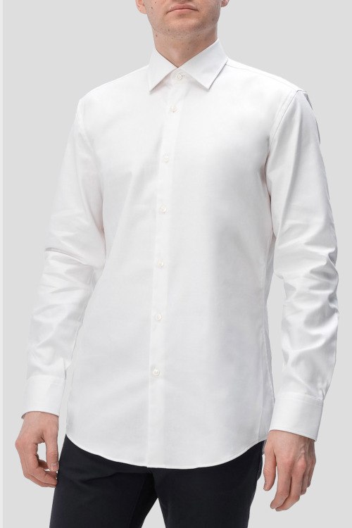 Детали: Мужская белая хлопковая рубашка Hank от Hugo Boss (Хуго Босс). Отложной воротник, застежка на пуговицы, манжеты на пуговицах, закругленный нижний край
