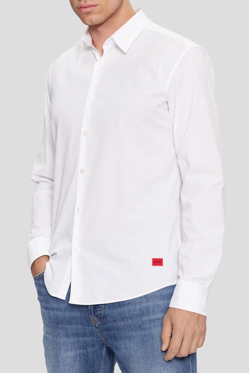 Детали: Мужская белая хлопковая рубашка Ermo от Hugo Boss (Хуго Босс). Нашивка с логотипом, отложной воротник, застежка на пуговицы, манжеты на пуговицах, классическая длина