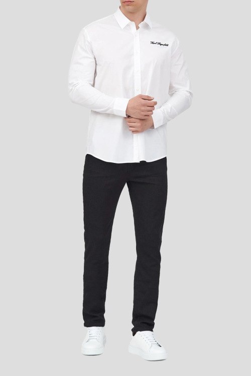 Детали: Мужская белая хлопковая рубашка от Karl Lagerfeld (Карл Лагерфельд). Логотип на груди, отложной воротник, застежка на пуговицы, манжеты на пуговицах, классическая длина