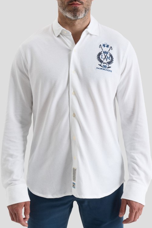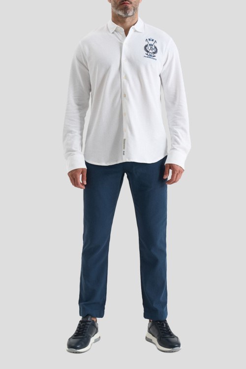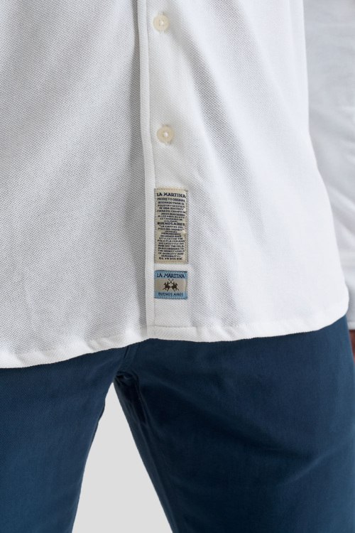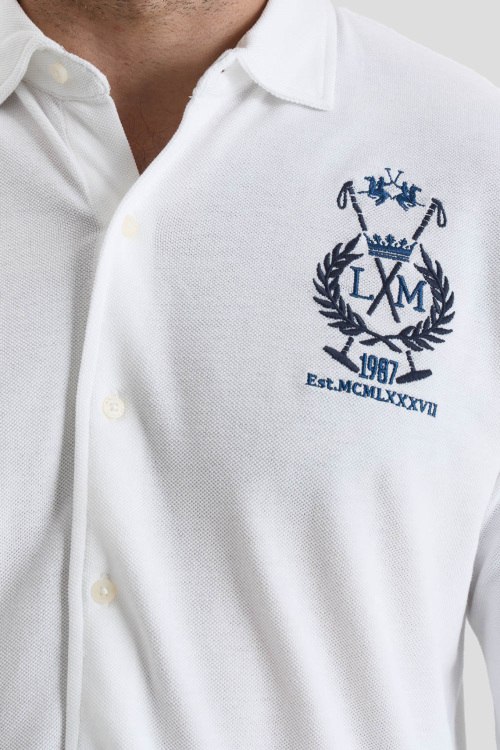 Детали: Мужская белая хлопковая рубашка от La Martina (Ла Мартина). Вышитый логотип на груди, отложной воротник, застежка на пуговицы, манжеты на пуговицах, закругленный нижний край
