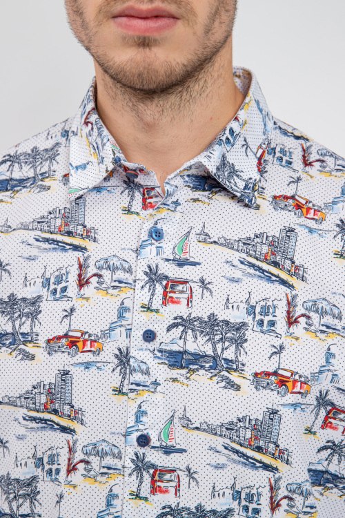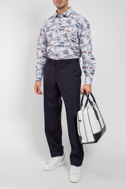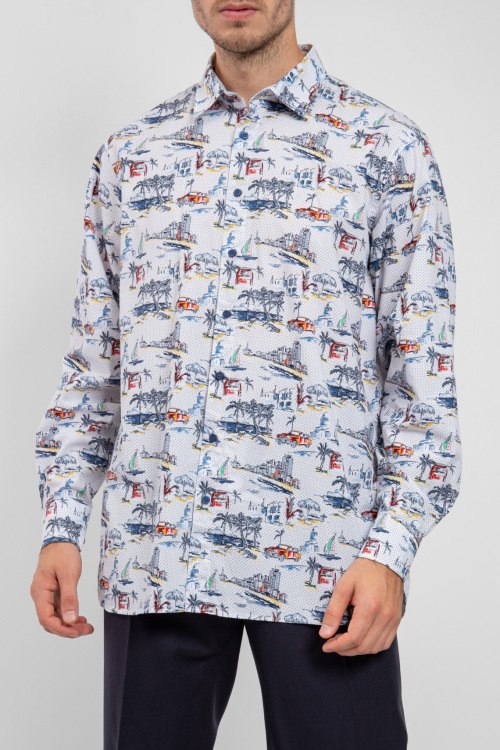 Мужская белая хлопковая рубашка от Marvelis (Марвелис). Принт по всей поверхности, отложной воротник, застежка на пуговицы, манжеты на пуговицах, удлиненная длина. Замеры для размера XL: длина 82 см, полу обхват груди 67 см, полу обхват талии 64 см, длина рукава 65 см.