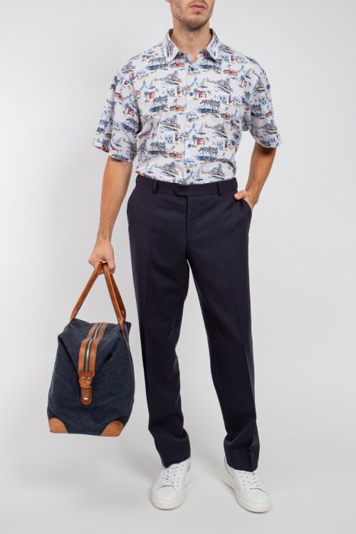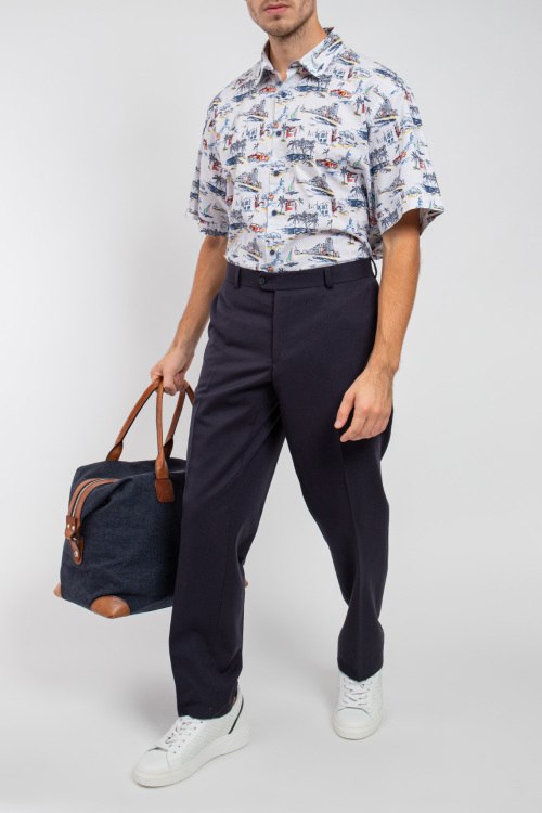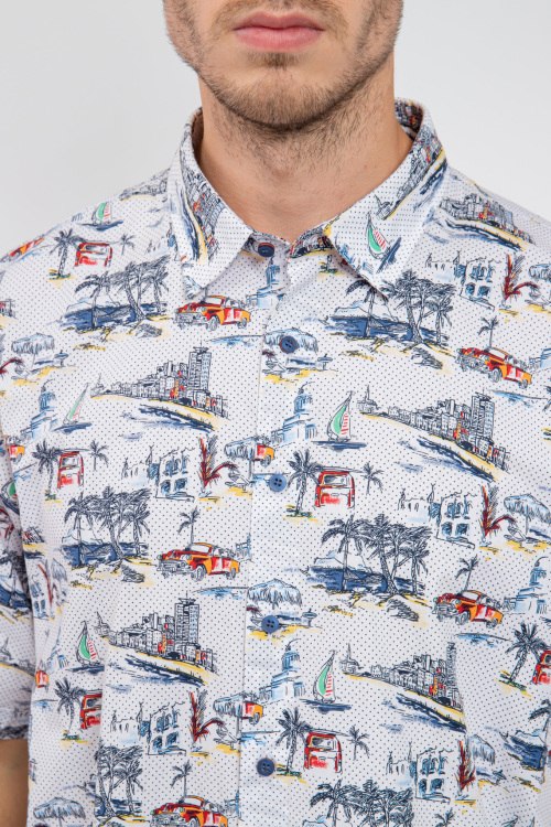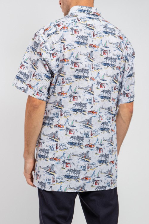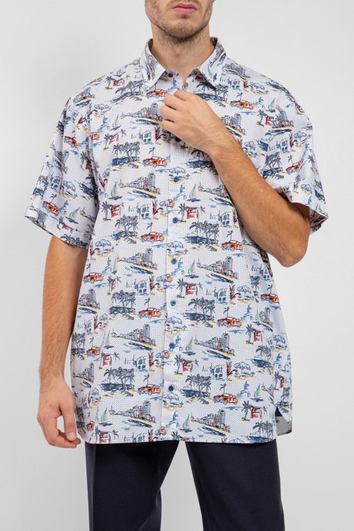 Мужская белая хлопковая рубашка от Marvelis (Марвелис). Принт по всей поверхности, отложной воротник, короткий рукав, застежка на пуговицы, удлиненная длина. Замеры для размера XXL: длина 86 см, полу обхват груди 71 см, полу обхват талии 70 см, длина рукава 27 см.