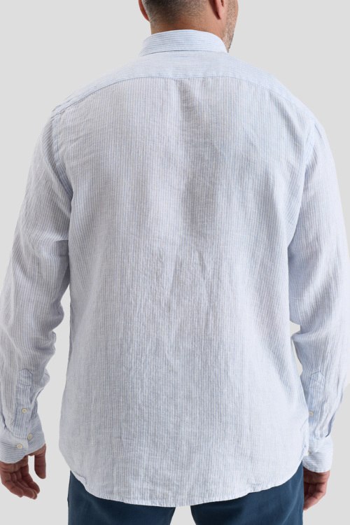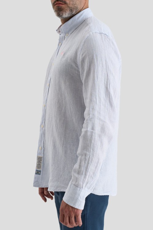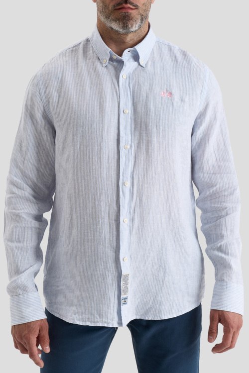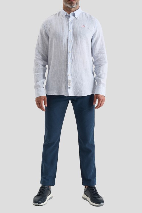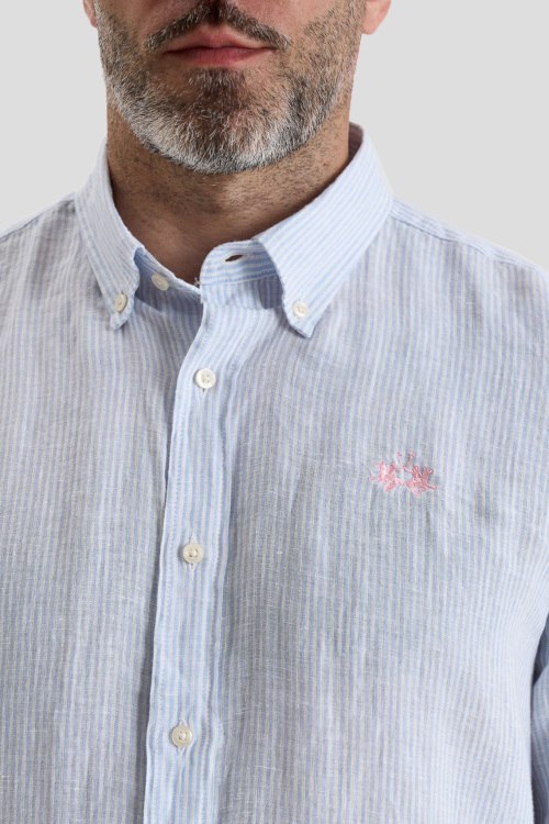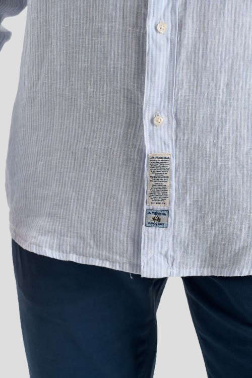 Детали: Мужская бело-голубая льняная рубашка от La Martina (Ла Мартина). Вышитый логотип на груди, тонкая полоска по всей поверхности, отложной воротник, застежка на пуговицы, манжеты на пуговицах, закругленный нижний край