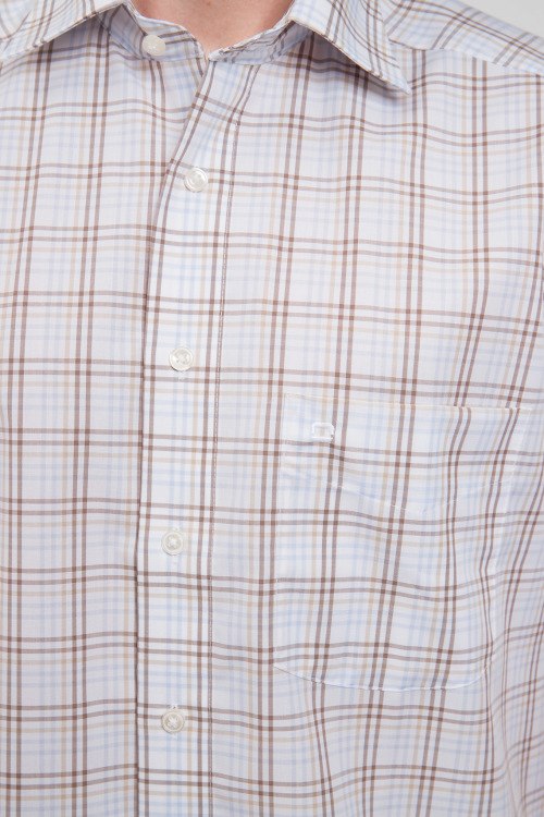 Мужская белая рубашка из хлопка от Olymp (Олимп). Дизайн в крупную клетку, классический воротник, застежка на пуговицы, короткие рукава, нагрудный карман, вышитый логотип бренда, ровный низ изделия.