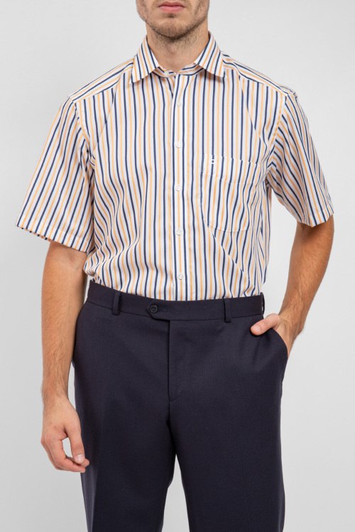 Мужская белая хлопковая рубашка Modern Fit от Olymp (Олимп). Полоска по всей поверхности, накладной карман на груди, отложной воротник, короткий рукав, застежка на пуговицы, удлиненная длина. Замеры для размера 41: длина 82 см, полу обхват груди 62 см, полу обхват талии 56 см, длина рукава 28 см.