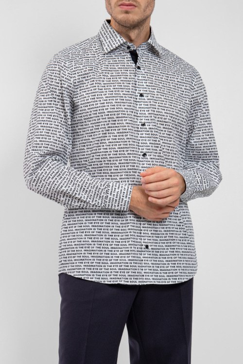 Мужская белая хлопковая рубашка Imaginationот Olymp (Олимп). Принт с надписью по всей поверхности, отложной воротник, застежка на пуговицы, манжеты на пуговицах, классическая длина. Замеры для размера 42: длина 78 см, полу обхват груди 58 см, полу обхват талии 52 см, длина рукава 67 см.