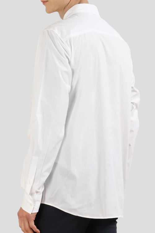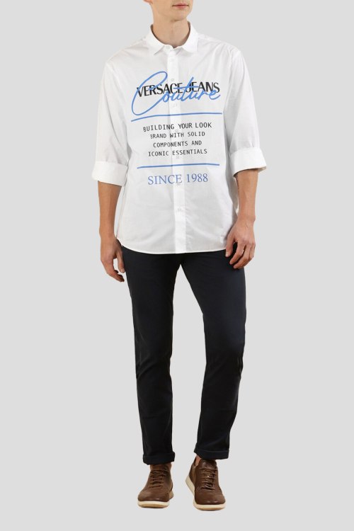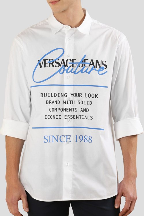 Мужская белая рубашка из хлопкового микса от Versace (Версаче). Классический воротник, застежка на пуговицы, длинные рукава, манжеты на пуговице, принт с логотипом бренда спереди, фигурный низ изделия