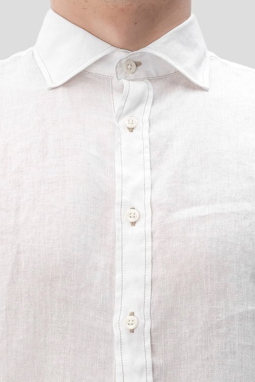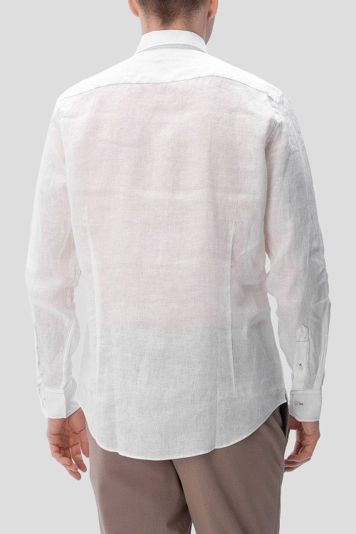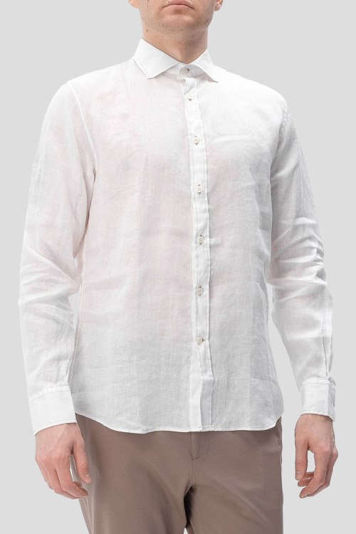Детали: Мужская белая рубашка из льна от Paul Taylor (Пол Тейлор). Классический воротник, застежка на пуговицы, длинные рукава, фигурный низ изделия