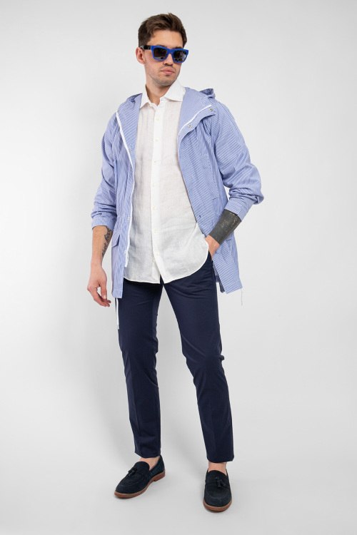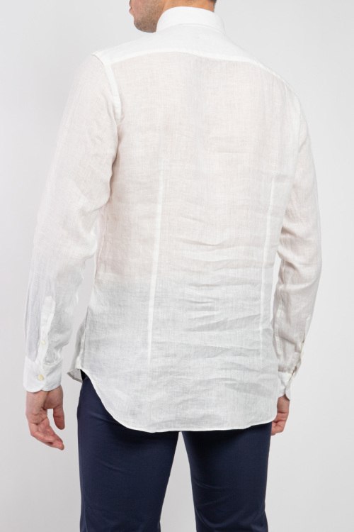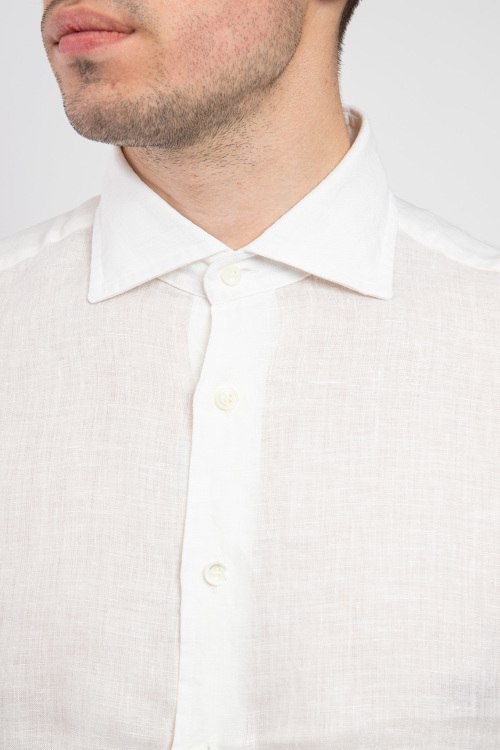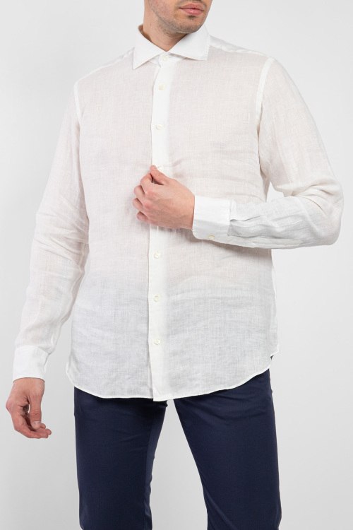 Мужская белая рубашка из льна от Tombolini (Томболини). Классическая длина, отложной воротник, застежка на пуговицы, длинные рукава, манжеты на пуговице, фигурный низ изделия.