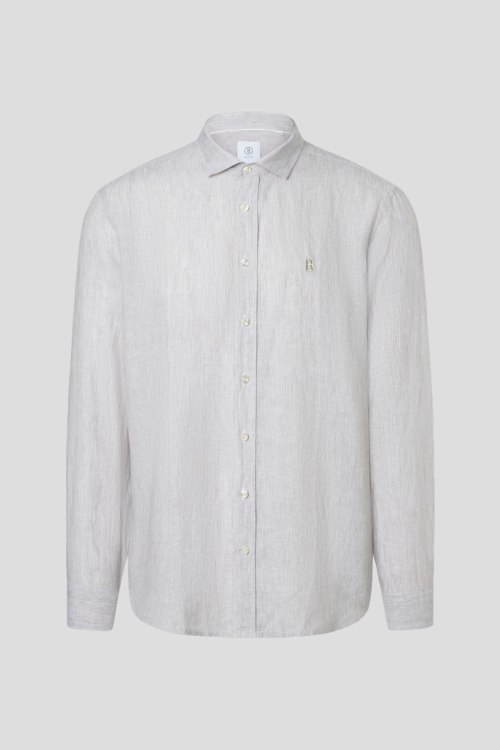 Детали: Мужская бежевая рубашка Timi из льна от Bogner (Богнер). Классический воротник, застежка на пуговицы, длинные рукава, манжеты на пуговице, фигурный низ изделия