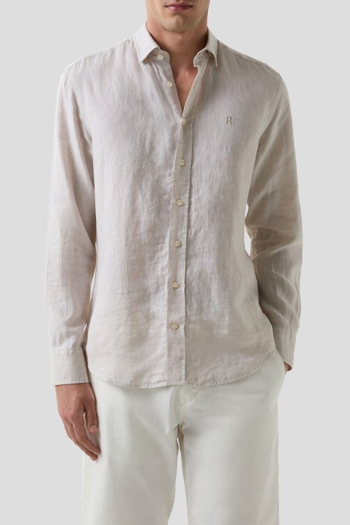 Детали: Мужская бежевая рубашка Timi из льна от Bogner (Богнер). Классический воротник, застежка на пуговицы, длинные рукава, вышитый логотип бренда, фигурный низ изделия