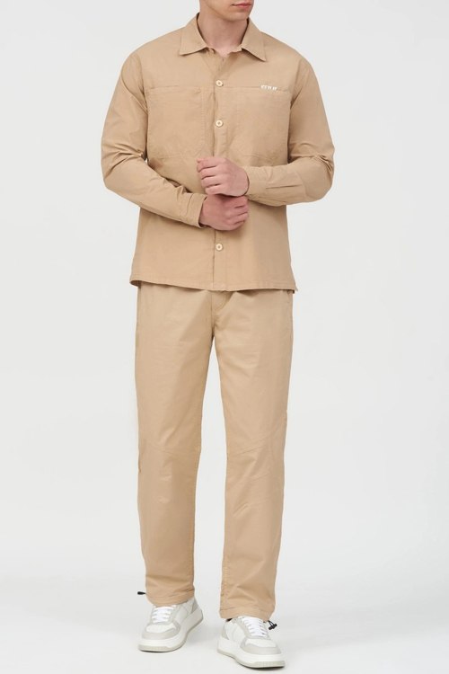 Детали: Мужская бежевая хлопковая рубашка от Ice Play (Айс Плей). Логотип и два кармана на груди, отложной воротник, застежка на пуговицы, классическая длина