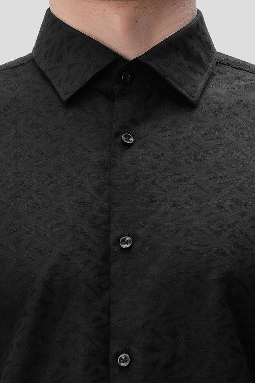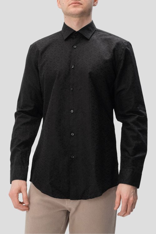 Мужская черная рубашка из хлопка и льна Kenno от Hugo by Hugo Boss (Хуго бай Хуго Босс). Отложной воротник, узор по всей поверхности, застежка на пуговицы, манжеты на пуговицах, закругленный нижний край.