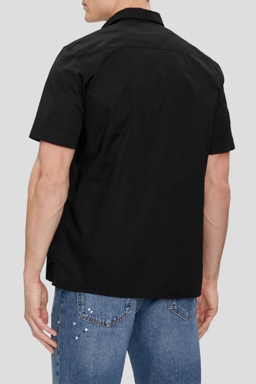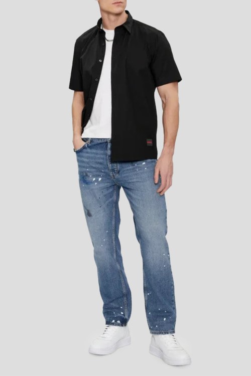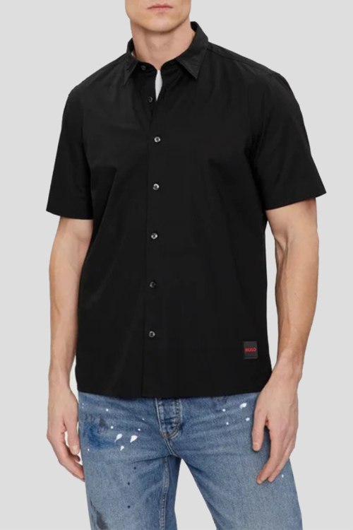 Детали: Мужская черная хлопковая рубашка Ebor от Hugo by Hugo Boss (Хуго бай Хуго Босс). Нашивка с логотипом, отложной воротник, застежка на пуговицы, короткий рукав, классическая длина