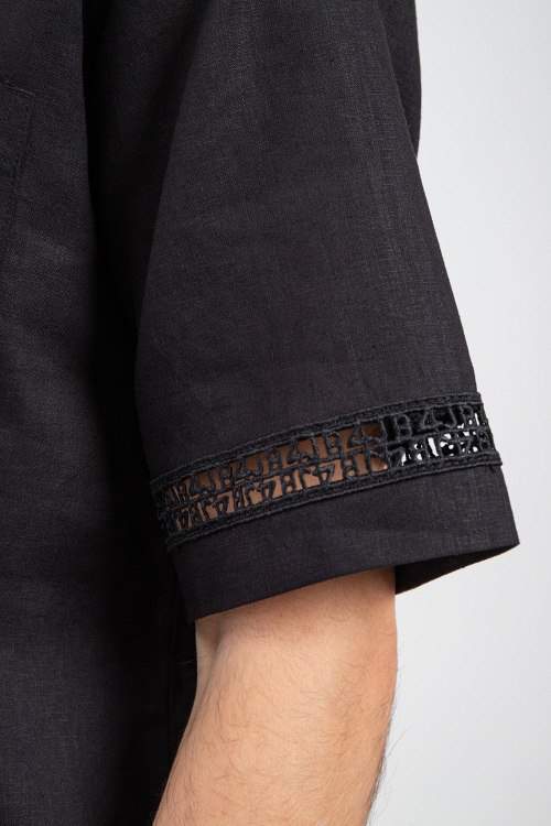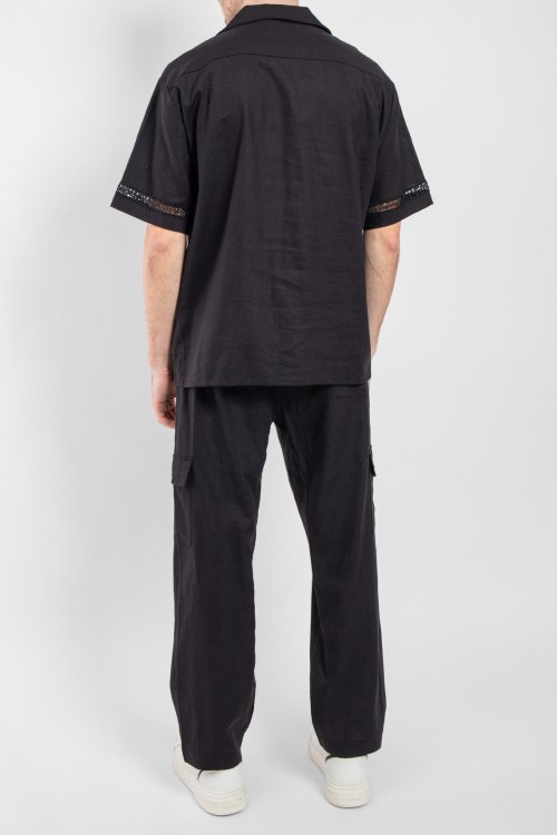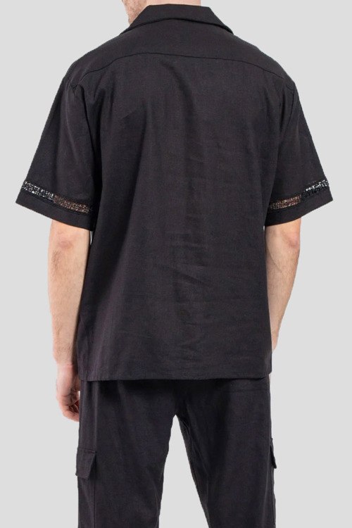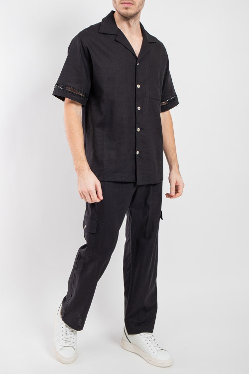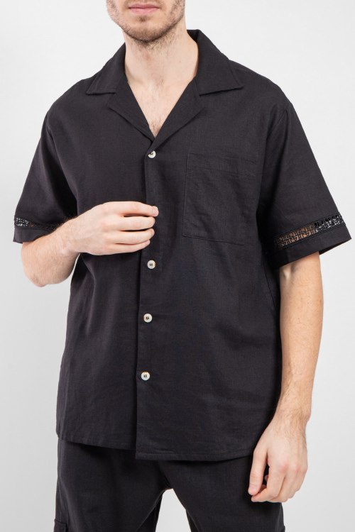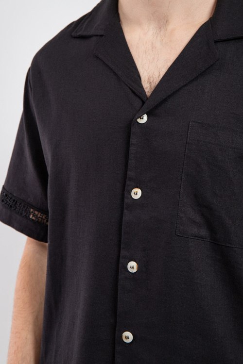 Мужская черная рубашка из льна и вискозы от J.B4 Just Before (Джаст Бифо). Отложной воротник, короткий рукав с вышивкой логотипа, карман на груди, застежка на пуговицы, классическая длина.