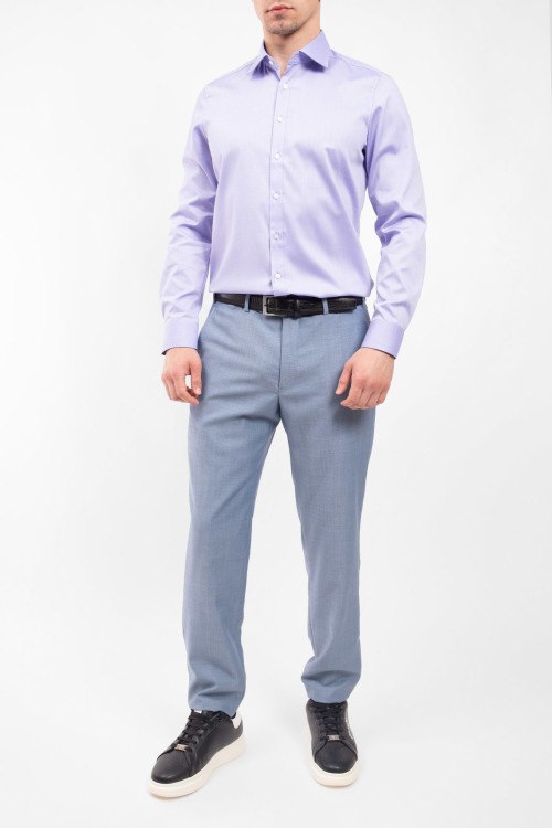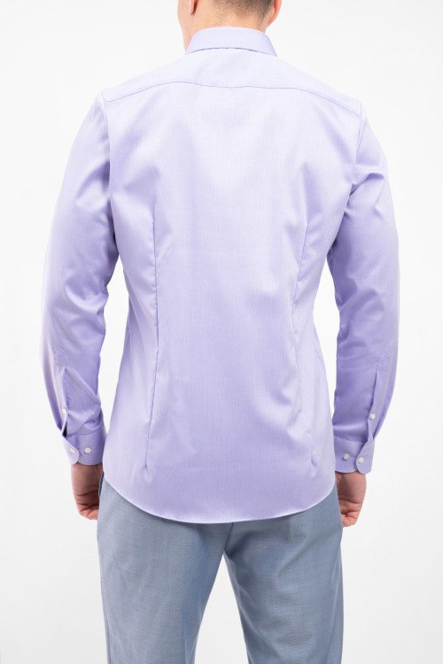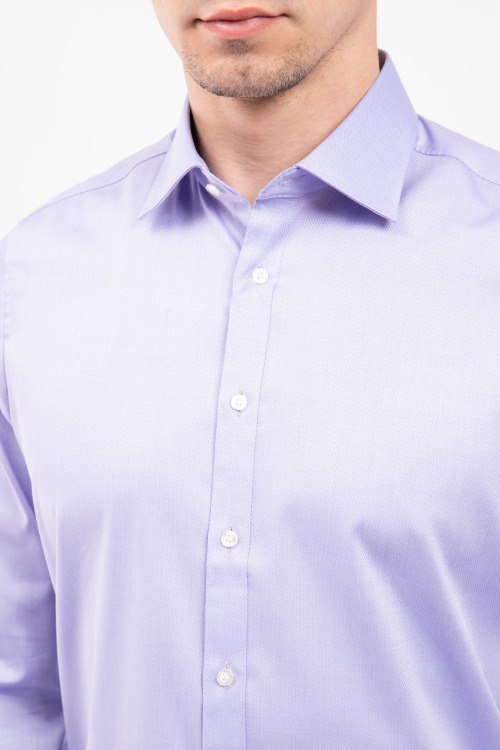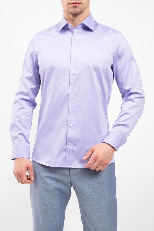 Мужская фиолетовая рубашка из хлопкового микса от Olymp (Олимп). Классический воротник, застежка на пуговицы, длинные рукава, фигурный низ изделия.