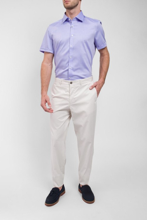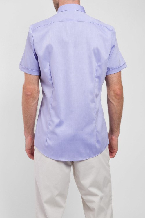Мужская фиолетовая рубашка из хлопкового микса от Olymp (Олимп). Модель Body fit, классический воротник, застежка на пуговицы, короткие рукава, манжеты с отворотом, вышитый логотип бренда.