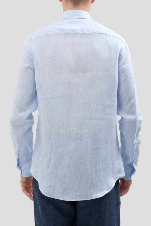 Детали: Мужская голубая льняная рубашка от Emporio Armani (Эмпорио Армани).Вышитый логотип на груди, отложной воротник, застежка на пуговицы, манжеты на пуговицах, классическая длина, закругленный нижний край