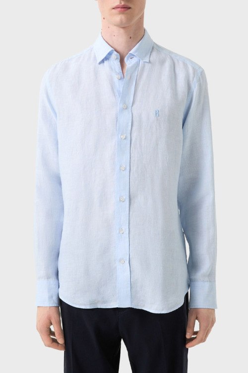 Детали: Мужская голубая льняная рубашка Timi от Bogner (Богнер). Классический воротник, застежка на пуговицы, длинные рукава, вышитый логотип бренда, фигурный низ изделия