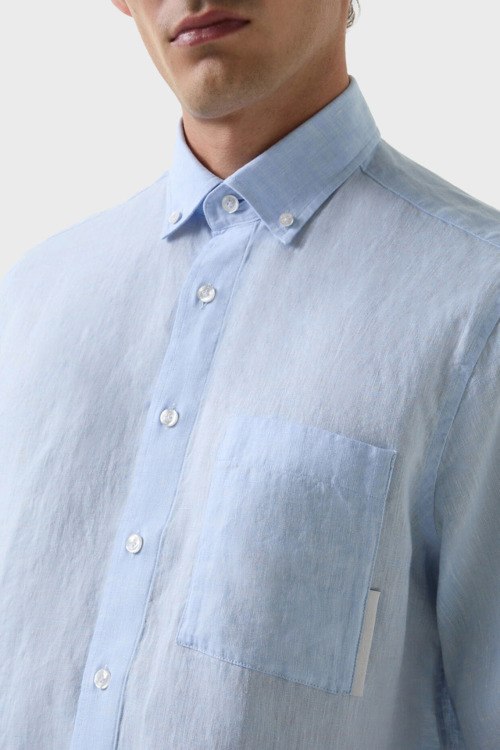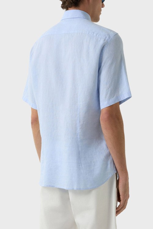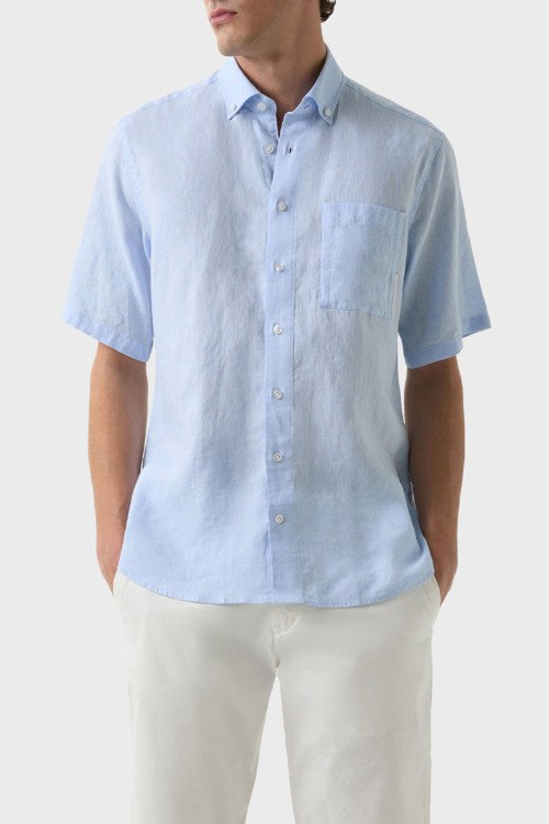 Детали: Мужская голубая рубашка Lykos-4 из льна от Bogner (Богнер). Классический воротник, застежка на пуговицы, короткие рукава, фигурный низ изделия, нагрудный карман