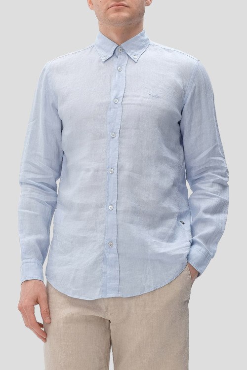 Детали: Мужская голубая льняная рубашка Roan от Hugo Boss (Хуго Босс). Логотип на груди, отложной воротник, застежка на пуговицы, манжеты на пуговицах, классическая длина
