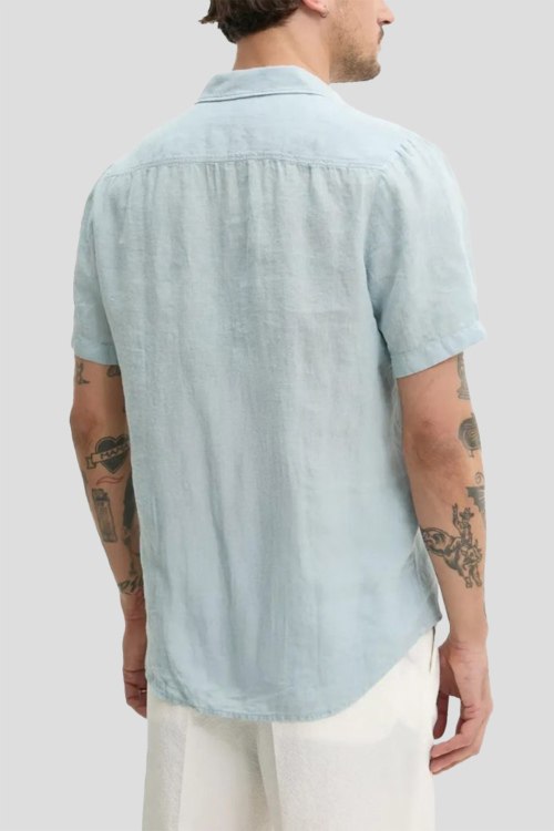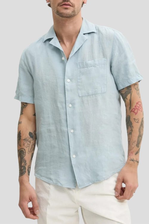 Детали: Мужская голубая льняная рубашка Ellino от Hugo by Hugo Boss (Хуго бай Хуго Босс). Отложной воротник, карман на груди, короткий рукав, застежка на пуговицы, классическая длина