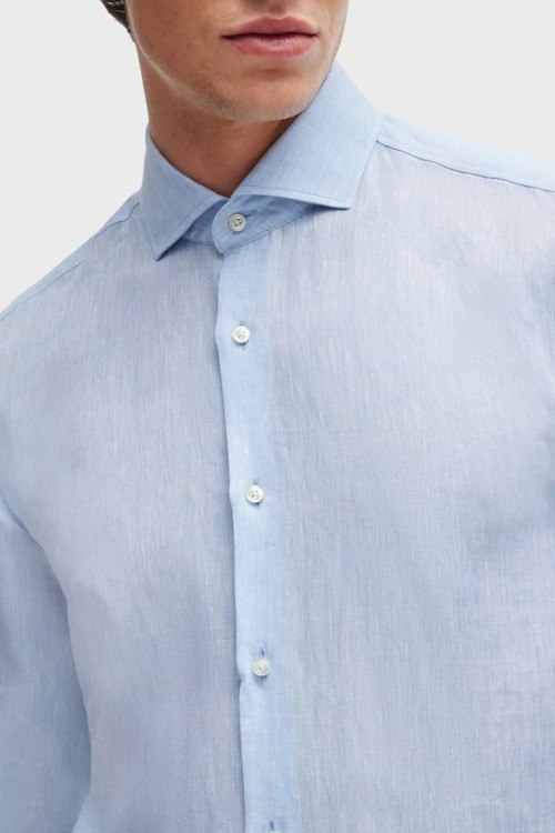 Детали: Мужская голубая рубашка из льна от Hugo Boss (Хуго Босс). Классический воротник, застежка на пуговицы, длинные рукава, манжеты на пуговицы