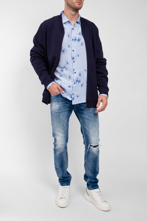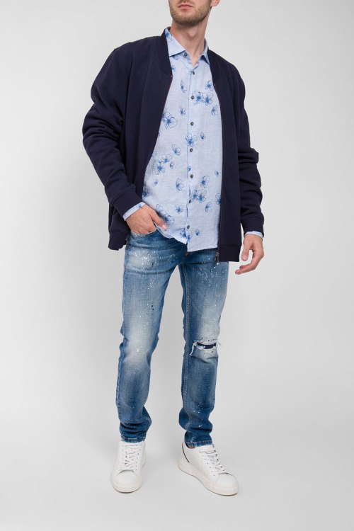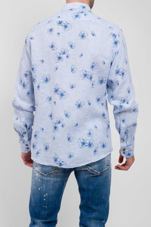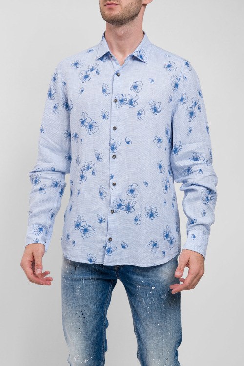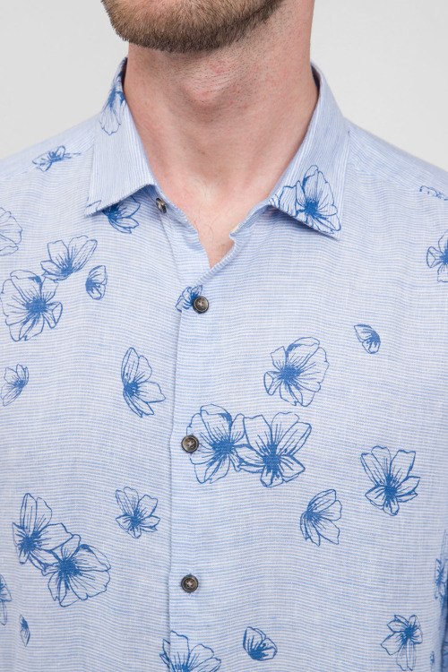Мужская голубая рубашка из натурального льна от Olymp (Олимп). Дизайн с цветочным принтом по всей поверхности изделия, модель Вody fit, классический воротник, застежка на пуговицы, длинные рукава, манжеты на пуговице, фигурный низ изделия.