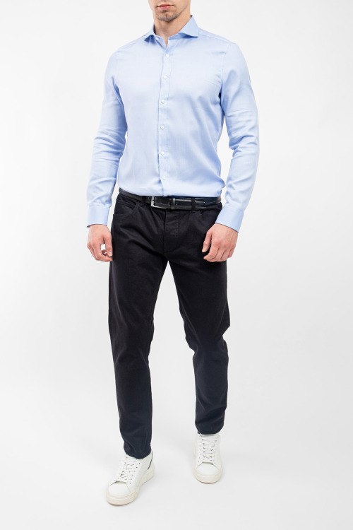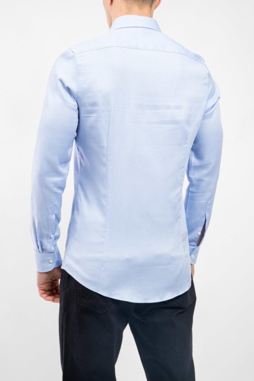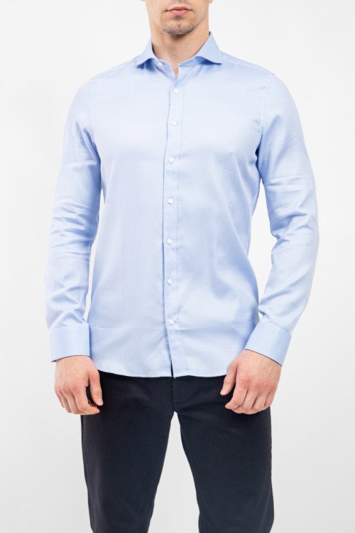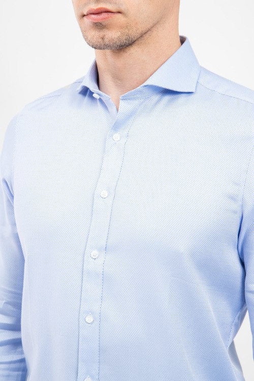 Мужская голубая рубашка из хлопкового микса от Olymp (Олимп). Классический воротник, застежка на пуговицы, длинные рукава, фигурный низ изделия.