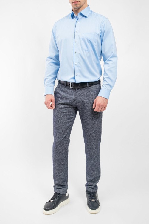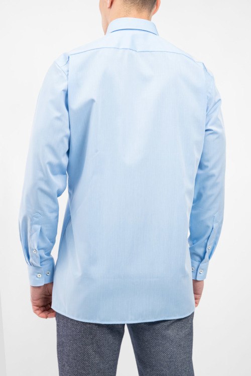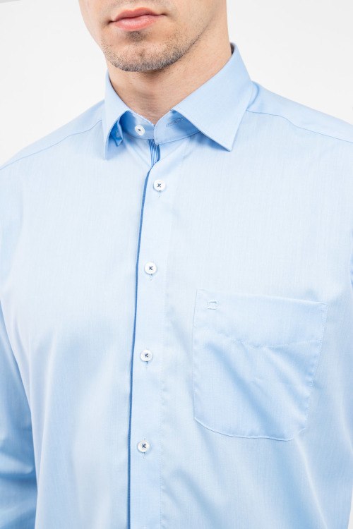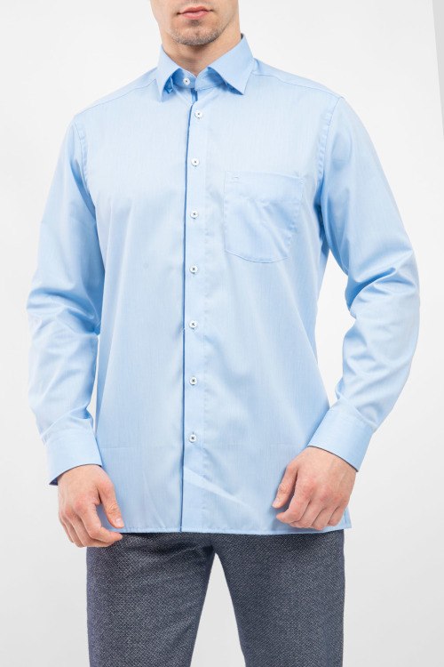 Мужская голубая рубашка из хлопка от Olymp (Олимп). Классический воротник, застежка на пуговицы, длинные рукава, ровный низ изделия, нагрудный карман.